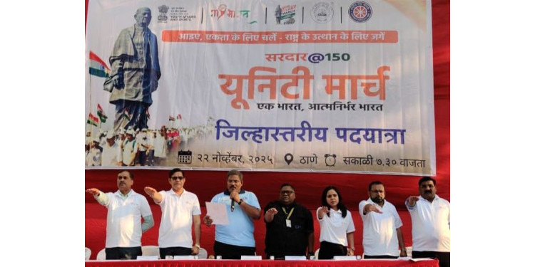ठाणे – सरदार वल्लभ भाई पटेल यांच्या १५० व्या जयंतीनिमित्त पदयात्रेचे आयोजन ठाणे येथे दिनांक २२ नोव्हेबर २०२५ रोजी करण्यात आले होते. या पदयात्रेचे उद्घाटन वाहतूक विभागाचे पोलिस उपायुक्त पंकज शिरसाट यांच्या हस्ते करण्यात आले. त्यांनी विद्यार्थ्यांना एकतेचे महत्व आणि वाहतुकीच्या नियमांचे पालन या संदर्भात मार्गदर्शन केले. राष्ट्रीय सेवा योजनेचे ठाणे जिल्हा समन्वयक प्रा.जीवन विचारे यांनी यूनिटी मार्च आयोजनामागील पार्श्वभूमी समजावत विद्यार्थ्यांना मार्गदर्शन केले.यावेळी माय भारत उपक्रमाच्या ठाणे जिल्हा कार्यक्रम अधिकारी मनिषा शर्मा, ठाणे महानगर पालिका स्वच्छता विभागाचे अधिकारी श्री.लक्ष्मण पुरी,लक्ष्मण चव्हाण उपस्थित होते. सोबतच वाहतूक विभागाच्या सोनार मॅडम,महाविद्यालयाचे उपप्राचार्य सुभाष शिंदे,डॉ.प्रियंवदा टोकेकर,विभाग कार्यक्रम अधिकारी प्रा.नीरज मिश्रा उपस्थित होते.